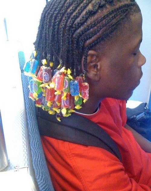 This has to be the hairstyle of the century. Now you can store your food in your hair for long trips. Anytime you get hungry you can just pick something off your head.