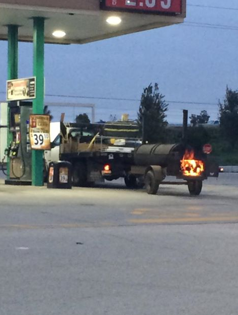 This guy came up to the gas station to fill up his tank and he had a barbeque pit trailer that was on fire at the gas station WTF DUUUUD
