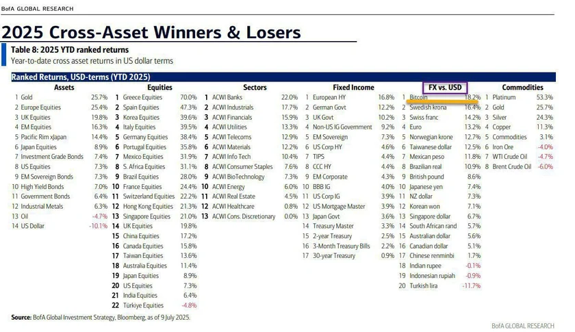 JUST IN: πΊπΈ Bank of America research report shows #Bitcoin as the best-performing currency this year