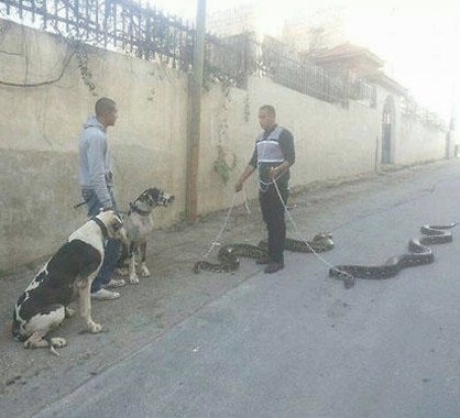 This guy really must have balls to be walking those around. It looks like they might be able to eat dogs. The other guy better be careful