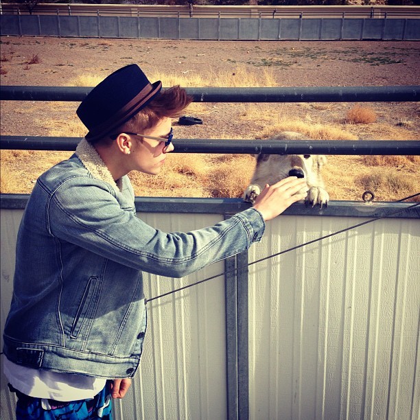 This isn't a dog! I'm not sure what it is! It looks like a big giant wild dog with claws. Da Biebs is giving him a snack! I bet that animal would look great wearing Justin's hat!