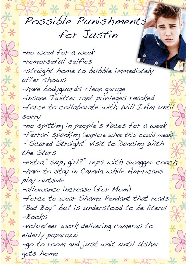 Teen pop sensation Justin Bieber is accused of threatening paparazzi, showing up late to concerts and spitting on a neighbor during a fight. As Justin’s behavior continues to get worse, his mother has come up with the following punishment ideas in hopes of disciplining the troubled teen.