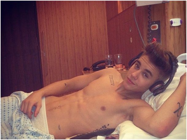 Justin Bieber Shirtless in his Hospital Bed After Collapsing on Stage During his Concert