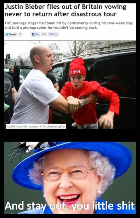 Justin Bieber teenager singer had been hit by controversy during his two weeks stay and told a photographer he wouldn't be coming back Queen answers And stay out, you little shit
