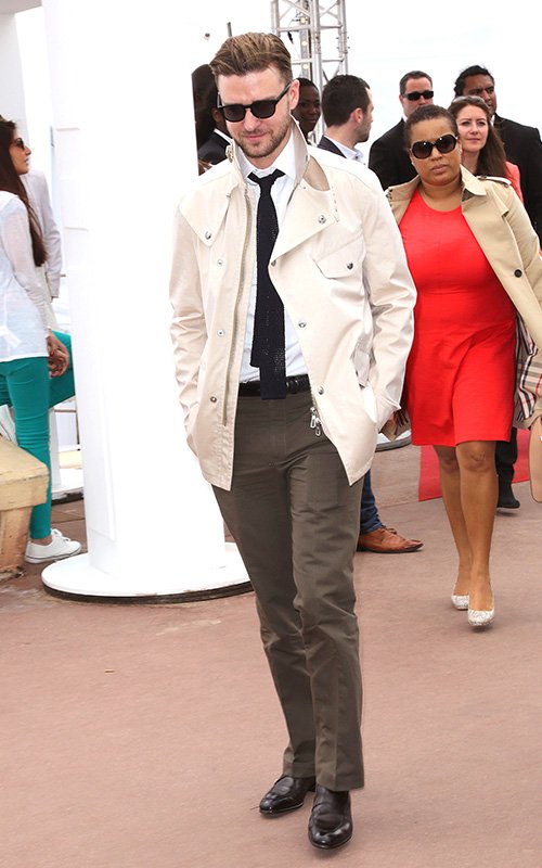Justin Timberlake the “Suit & Tie” singer made his way around the Croisette sporting a loosened necktie with a khaki jacket and black sunglasses.