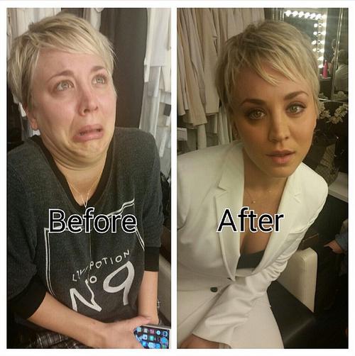 Kaley Cuoco’s proves that she's not just hilarious on The Big Bang Theory, but she also has an adorable sense of humor when she posted this before and after pictures, thanking her beauty team for the transformation.