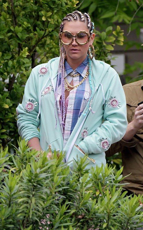 The “Your Love is My Drug” songstress donned a corn row hairpiece with some massive gold chain glasses and plenty of fake bling as she filmed her scenes.