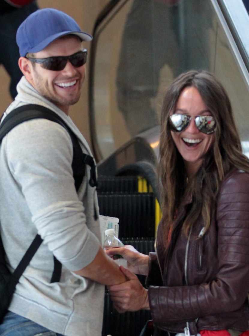 Kellan Lutz and Sharni Vinson have a laugh on the escalator at Los Angeles International Airport on Thursday morning (4/4/2013) in Los Angeles.