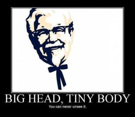 Big head tiny body. You can't unsee it! Colonel Sanders bow tie looks like a little tiny body under his iconic face and head. Hilarious! Finger lickin good. I could go for some chicken now.