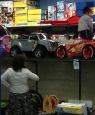 Hey how did you get up there? One wrong step and you are going to fall onto the other crazy people of walmart. Crazy is starting young