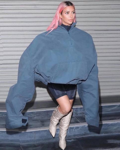 Kim Kardashian is wearing Shaq's clothes again. His sweatshirt is a little too large for her. Her arms are dragging on the ground. I'm thinking Kanye might be a little jealous.