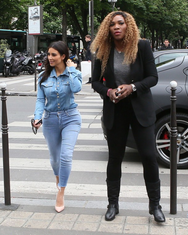 The angle and their body placement have something to do with this, but we still can't help but be amazed at how short Kim Kardashian is. Serena Williams is a tall and muscular woman (amazing tennis player as well) but in this picture, her frame looks gigantic compared to Kim. Well Kim has larger hips though (seriously, how large is her hips circumference?)
