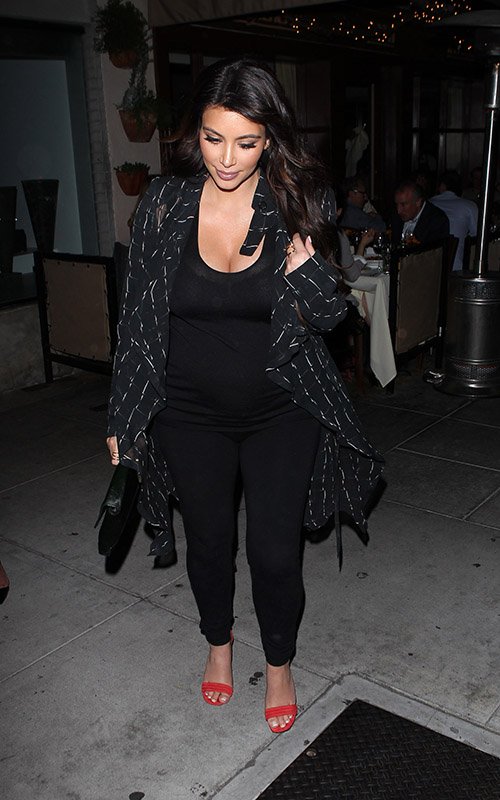 The “Disaster Movie” dame met up with some friends for dinner, showing off her baby bump in a sheer black blouse with black leggings and black box patterned jacket.