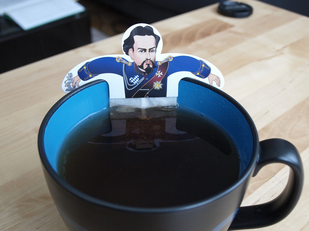Herb the king is tea bagging my tea! He looks like the King of Prussia or King Ludwig! Either that or Johnny Depp is in my tea. Hope he does not pee or have the runs because I love my Earl Grey tea.
