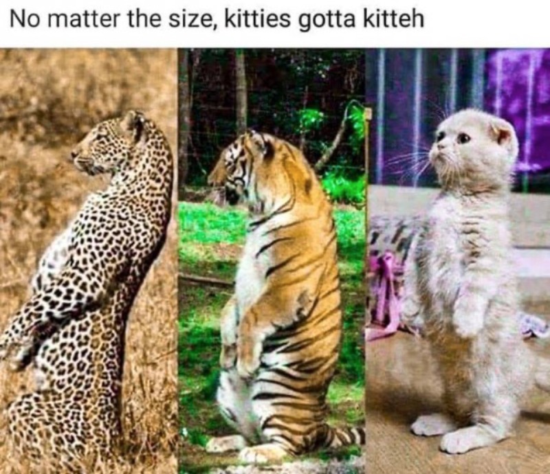 No matter the size, kitties gotta kitten. Out of the lion, leopard and kitten I think the kitten has the most Kitteh