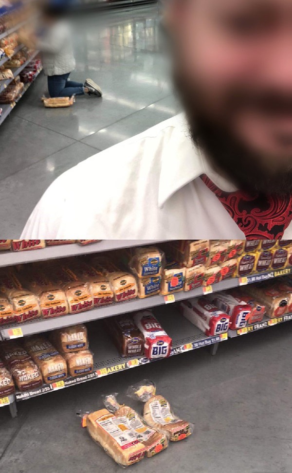 Using a loaf of bread as knee pads at Walmart. Leave it to people of Walmart