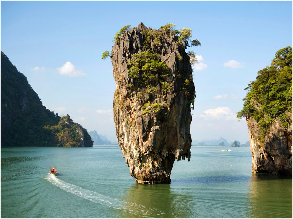 A boat skirts Ko Tapu Island, a natural formation off the coast of Thailand that’s also known as the “James Bond Island”—it famously appeared in the 1974 film The Man With the Golden Gun, a star turn that has made it a popular tourist attraction in the decades since.