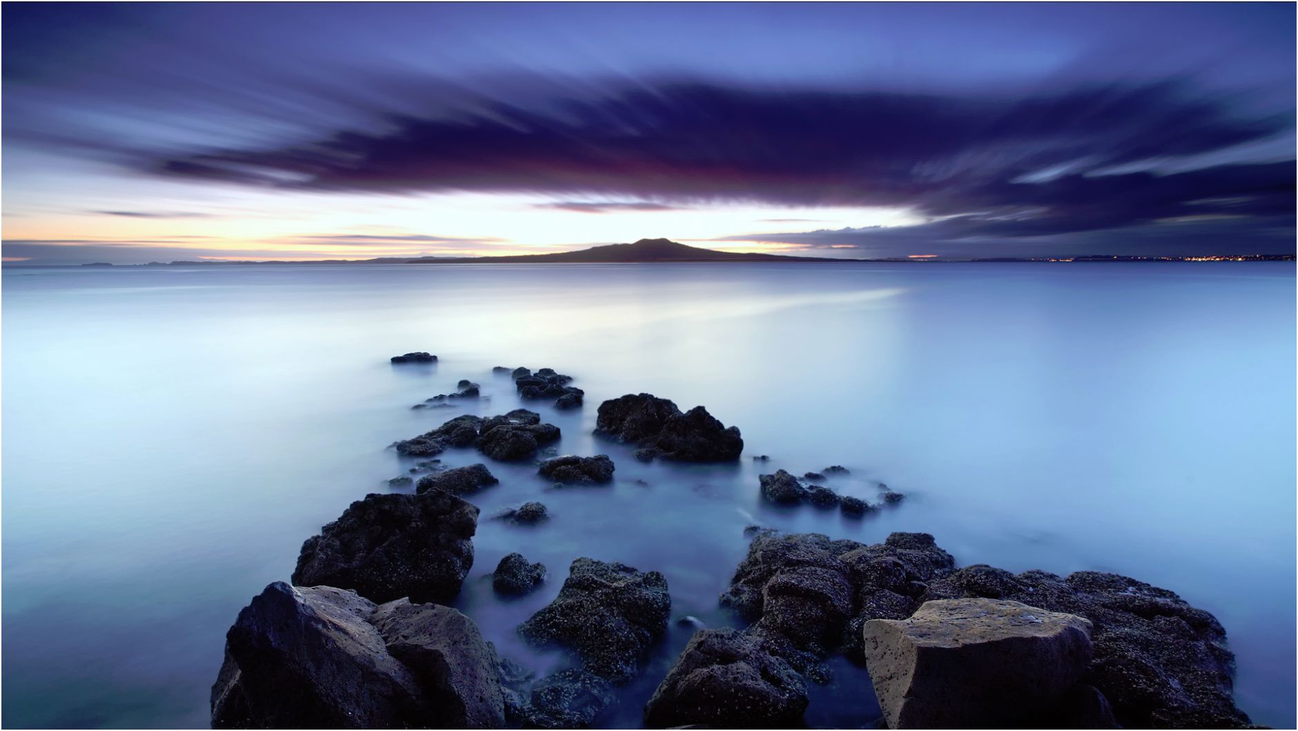 Layer of rocks by the shore and the mountain on the other side of the lake that is covered in fog
