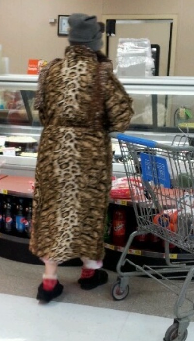 The epitome of fashion! A leopard fur coat with matching morning slippers. Dress up and dress down at the same time!