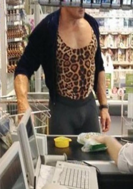 This guy really knows how to dress up for Walmart. He's got the leopard print leotards with that Tarzan like look. They go really well with his sweatpants.
