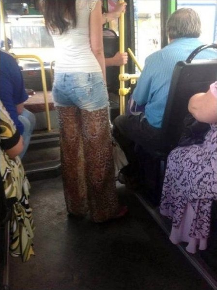 Leopard Print Pants Under Jean Shorts on the Bus - No Way Girl - Fashion Fail