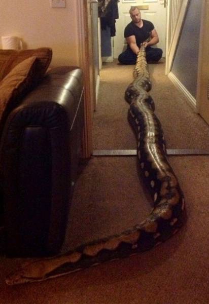 Wow that's one huge snake. What does this thing eat people? Any larger and they are going to have to buy it a separate house.