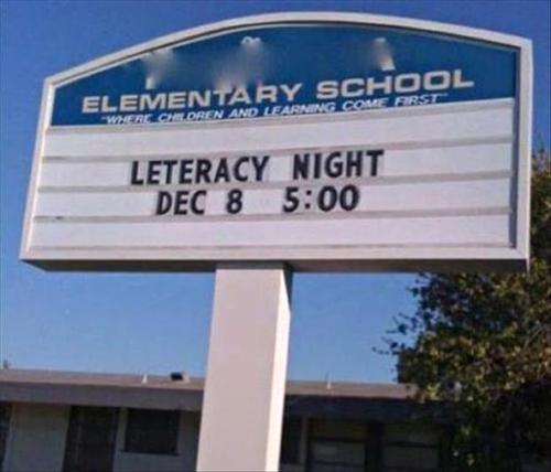 How ironic that this sign that tries to promote a literacy night, yet, it showcases its own illiteracy in the process.