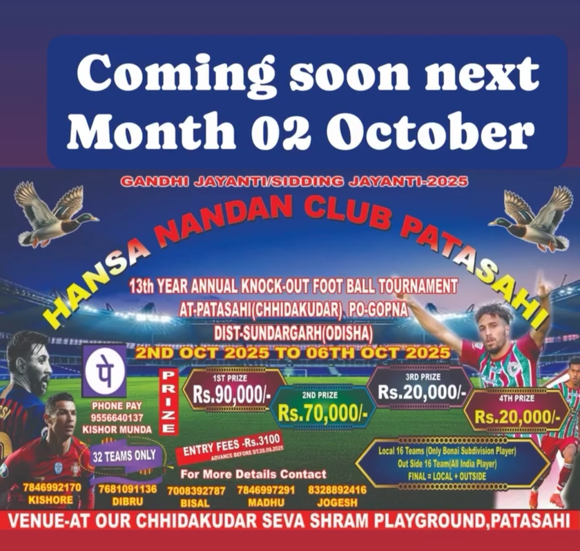Let's ready Guy's and Grand Welcome, to my Village inter-villege level Organized Football Tournament. This Grand event will be loading soon.... Check further details. The Football lovers and local players will be Chill and benefited with this tournament. Sundargrah and Jharkhand Audiences will be gathered, this Tournament history was soo Old. Let's see you soon in the Tournament Match ⚽🥳🙂🤗😎