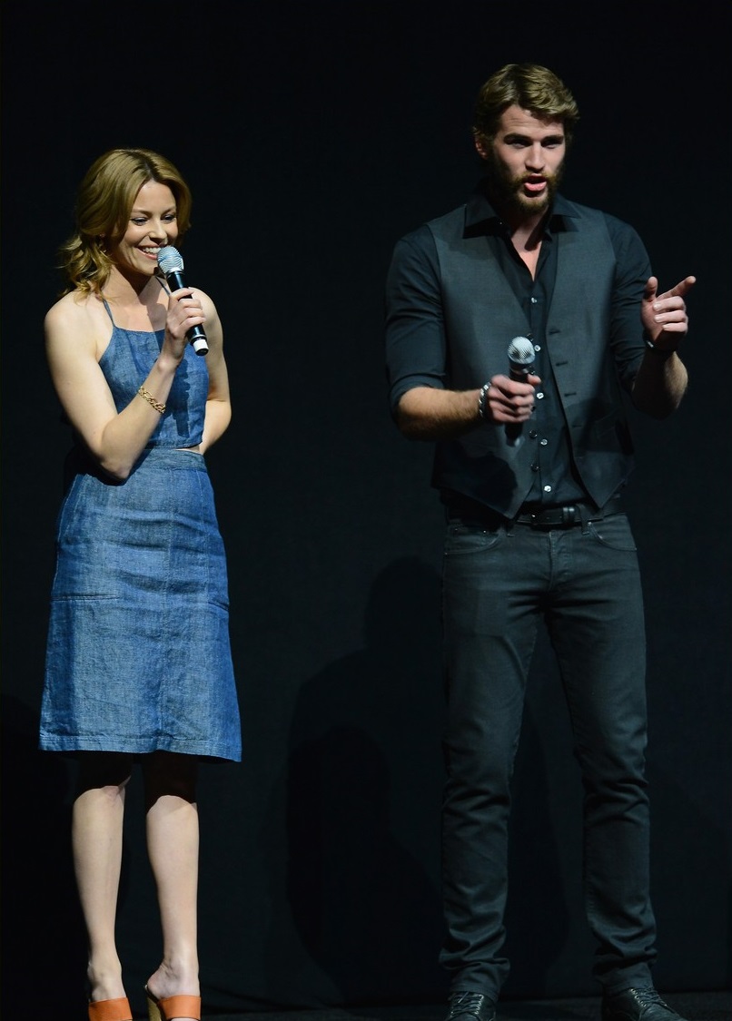 Liam Hemsworth joins co-star Elizabeth Banks during the Lionsgate Motion Picture Group Presentation during 2013 CinemaCon in Las Vegas on Thursday evening (April 18).