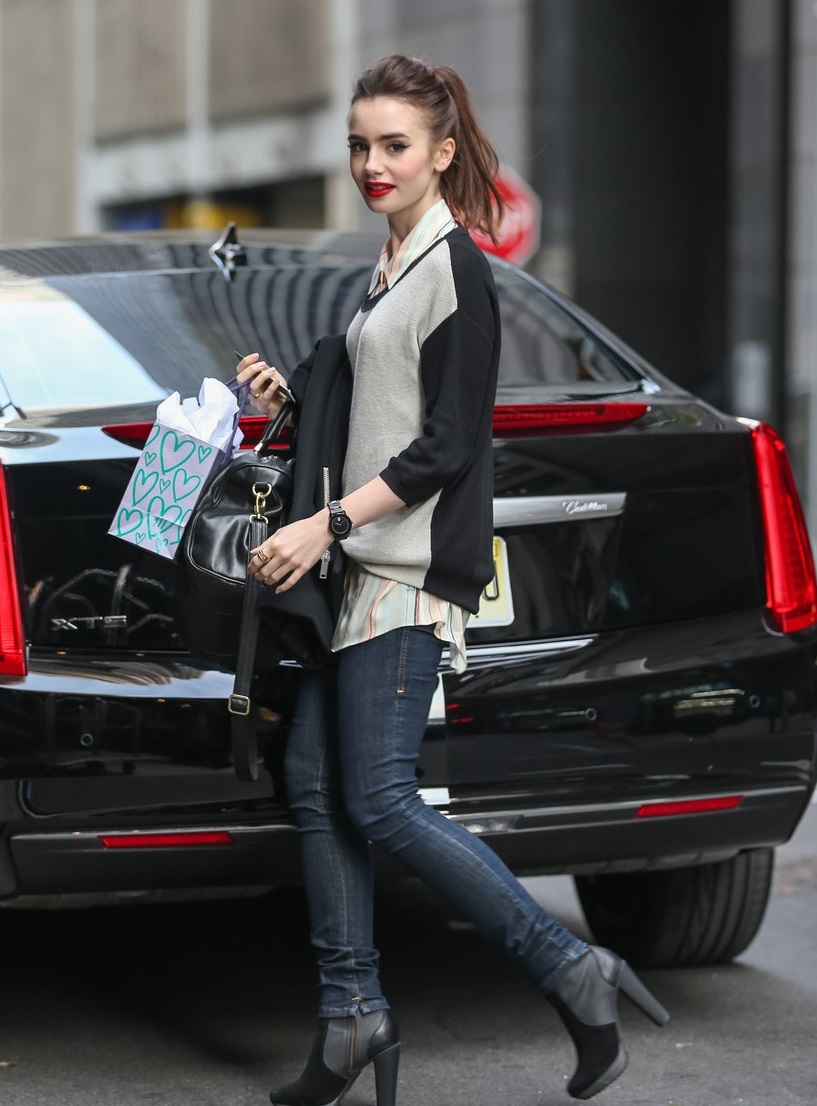 Lily Collins is vintage chic with red lipstick outside of Bergdorf Goodman on Thursday afternoon (4/4/2013) in New York City.