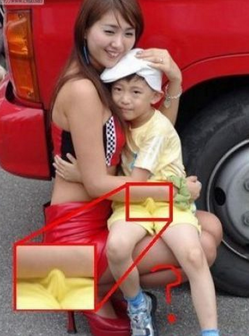 How cute is this a little guy is getting a huge hug from a car model,,, ooo what what is this something is making his yellow shorts go up and up.