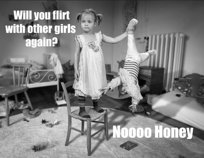 Will You Flirt With Other Girls Again? Noooo honey! Apparently this little girl gets very jealous when her baby brother flirts with the ladies and hangs him upside down by one leg!