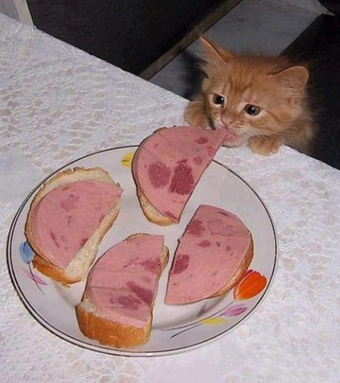 Time for some animal cuteness. look at how cute this little kitty looks as she trys to steal some meat from the sandwich