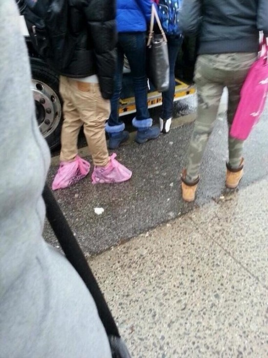 This guy must really not want his sneakers to get wet. A plastic bag should save them but at the expense of looking like a complete idiot.