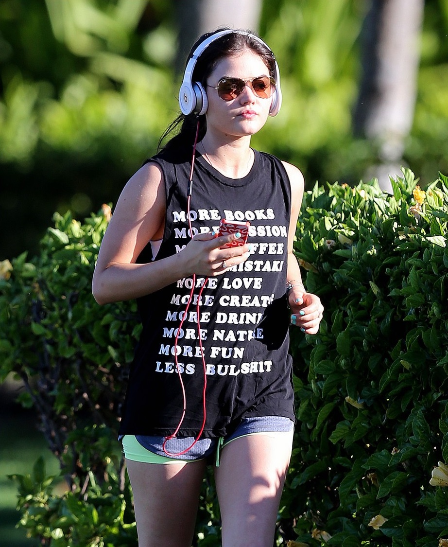 Lucy Hale pulls on her Beats by Dre headphones while out for a run in Maui, Hawaii on Monday morning (July 1).