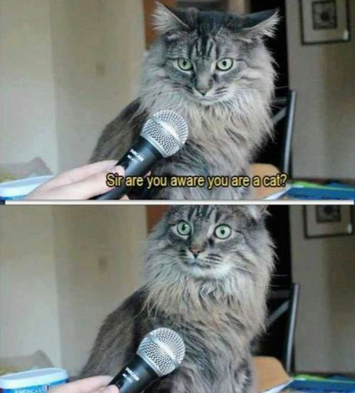 Sir are you aware your a cat? No. They are not aware they are cats! They think they are little humans in fact, and they are in charge. Well that's speaking for cats. Main Coons are gentle giants!