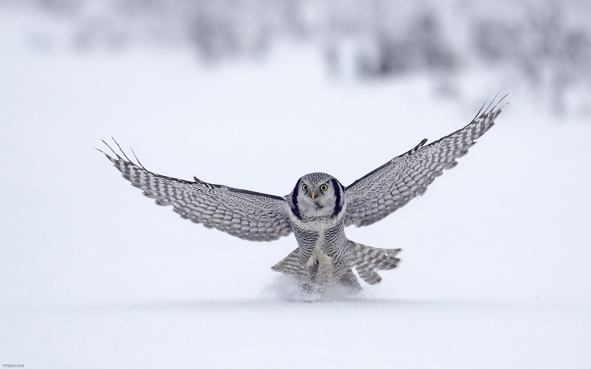 Majestic owl sweeping down towards the freshly fallen white snow.