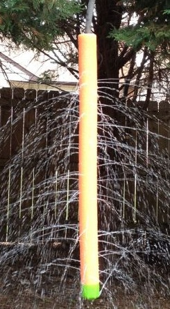 Puncture the pool noodle randomly around all sides of the noodle. The more holes, the better spray. Take note of the photo. Stuff one end with a small piece of foam or plastic cap, then duct tape the end securely. Decide where you would like to use the sprinkler. Try it on the ground or hanging, possibly from a swingset. Position your hose and then slide the end of the hose into the foam noodle, pushing it in a few inches so it holds securely. Turn on the hose and the fun will begin!