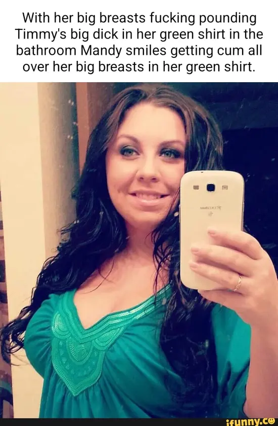 Mandy smiles getting cum all over her big breasts in her green shirt in the bathroom from Timmy's big dick.