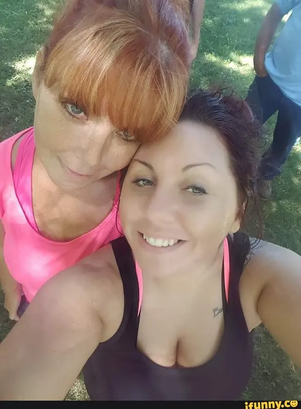 Mandy smiles taking this picture of her big cum breasts fucking pounding Timmy's big dick in her pink and black sports bra outside as her mom Kellie watches.