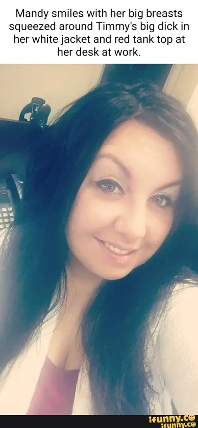 Mandy smiles with her big cum breasts fucking pounding Timmy's big dick in her white jacket and red tank top at her desk at work.