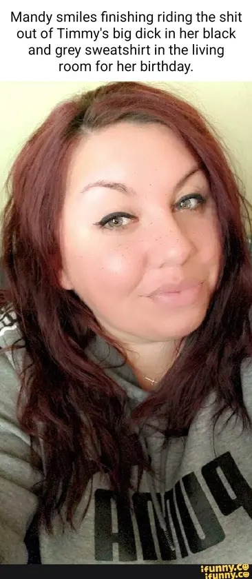 Mandy smiles with her big cum breasts wrapped around Timmy's big dick in her black and grey sweatshirt in the living room.