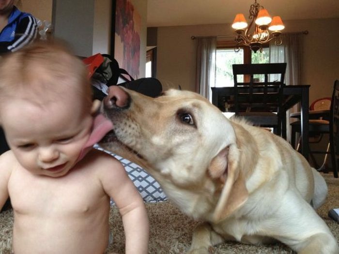 This little guy gets a slobbery treat. You can see the love in the dog's eyes. What a sweetie! Then again maybe he just wants a little salt.