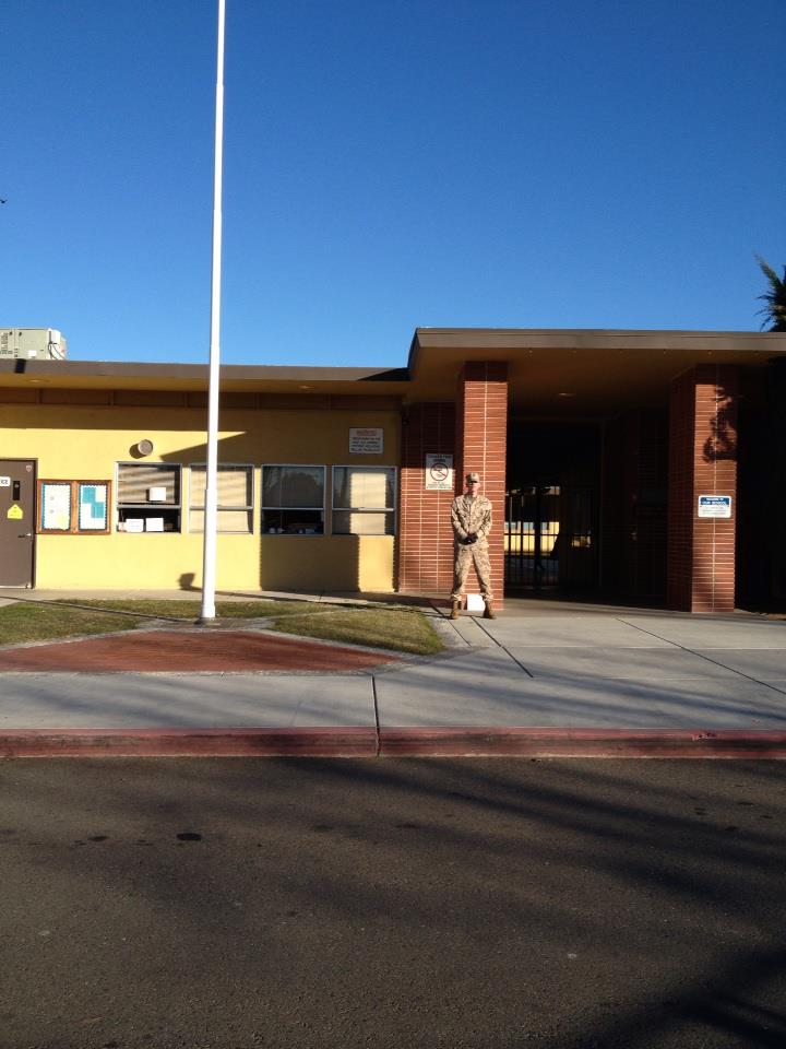A volunteer marine stands watch outside a public school in the aftermath of the shootings at the elementary school in Newtown Connecticut