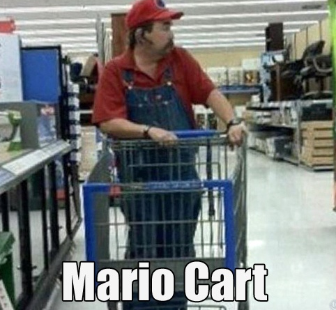 mario is just waiting for his racing buddies to start racing down the aisle at walmart.