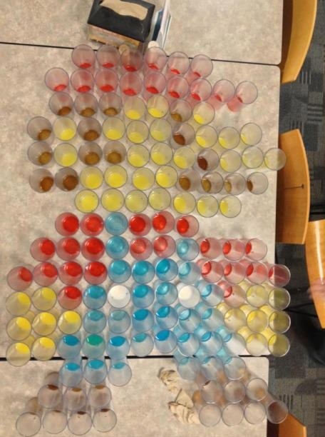 Here's an awesome recreation of everyone's favorite video game character, Mario! This artistic rendition of the hero was made using only cups filled with colored drinks.