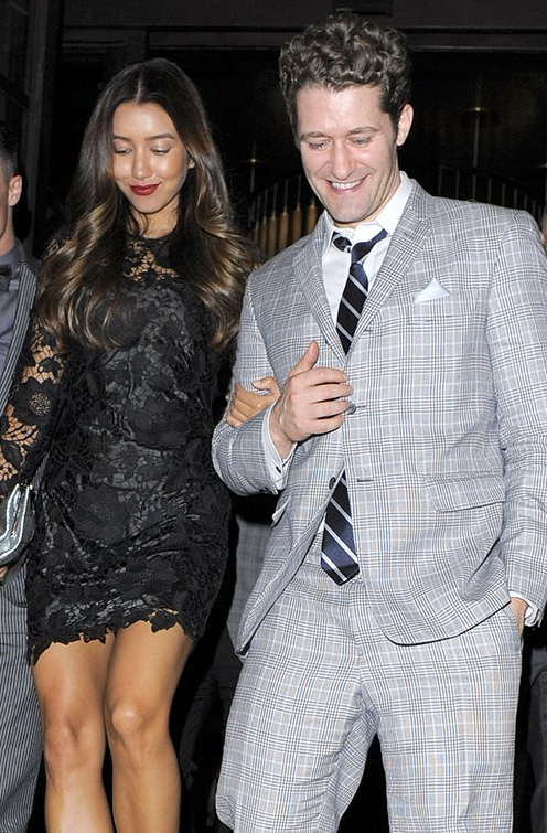 Dapper in a grey sit and blue tie, Matthew Morrison lent his arm to his lovely lady Renee Puente as they headed to the festivities at the "Corinthia" Hotel, where they stayed late in to the night.