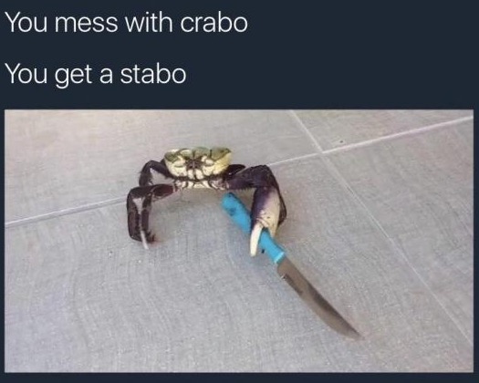 You mess with the crabo you get a stabo. If it's a Monday I'll probably pinch you with my big claws for good measure. By Friday I'm good again.