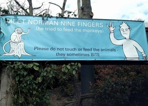 Meet Norman nine fingers. He tried to feed the monkeys! Please do not touch or feed the animals. They sometimes BITE!