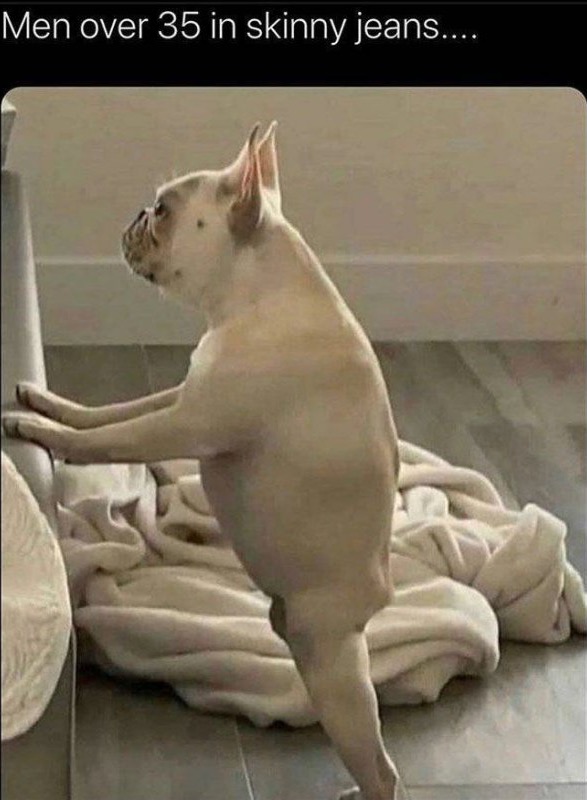 Tiny butt. Big gut. Skinny arms and legs. This dog sums it up!